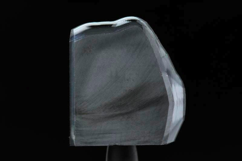 This is the top of a small diameter silicon crystal produced in research. The small cutoff circle is where the seed crystal was attached, where that seed was lowered into a pool of molten silicon and this crystal slowly pulled out, sticking to the solidified material by surface tension and then solidifying itself.