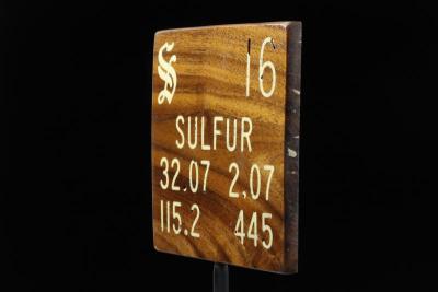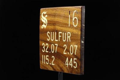 I created this sulfur inlaid copy of an element tile for a Popular Science column about sulfur inlaying. See that article (available online) for more pictures and a description of the method.